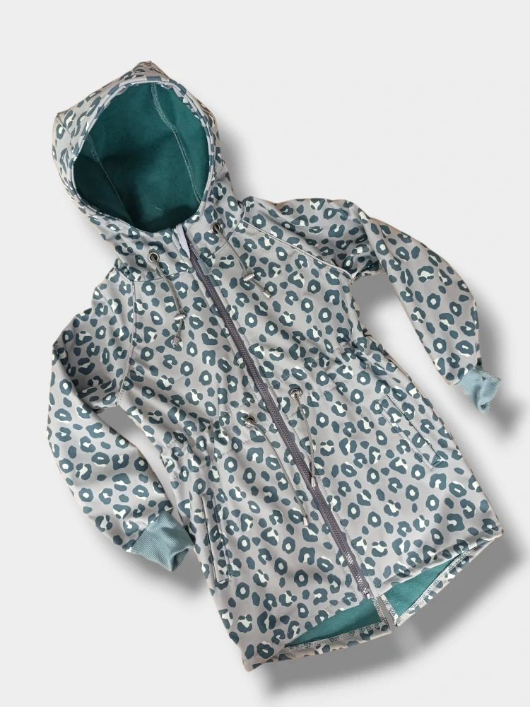 - Kabátek má velké kapsy , stahování v pase a v kapuci na šňůrku s brzdičkou .